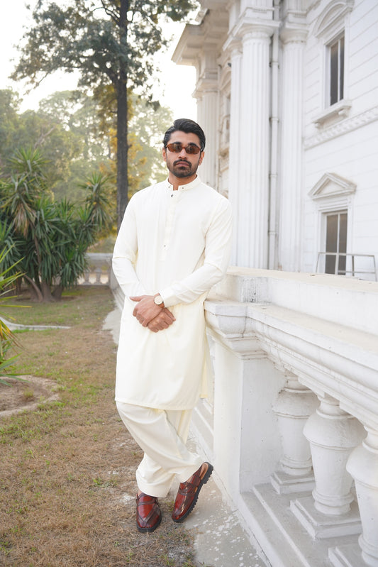 Ivory-cream gol gehra collar kurta with golden button, 1.5cm logo & farshi shalwar Collar