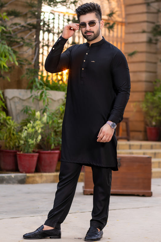 Black gol gehra collar kurta with golden button, 1.5cm logo & farshi shalwar Collar