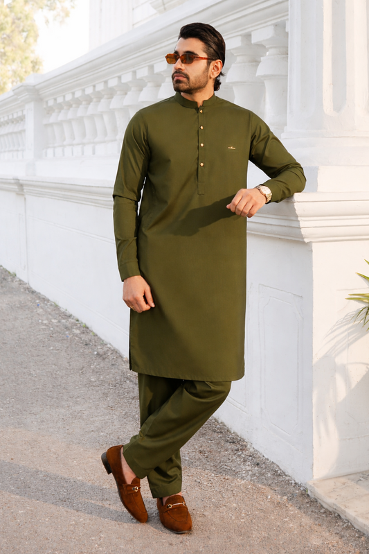 Stitched 3d Badge collection shalwar kameez - Olive