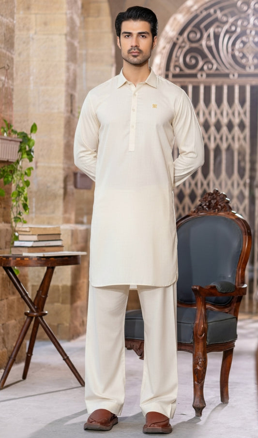Stitched Diamond Collar Shalwar Kameez Suit - Egg white