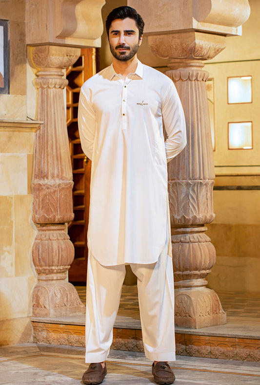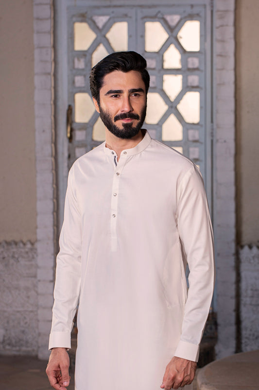 NAWABI METAL GLASS BUTTON STITCHED SUIT WITH SHALWAR - White