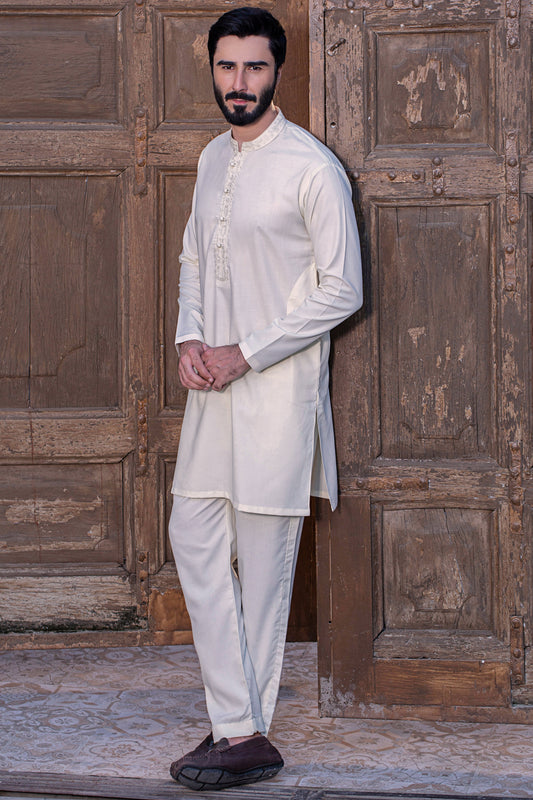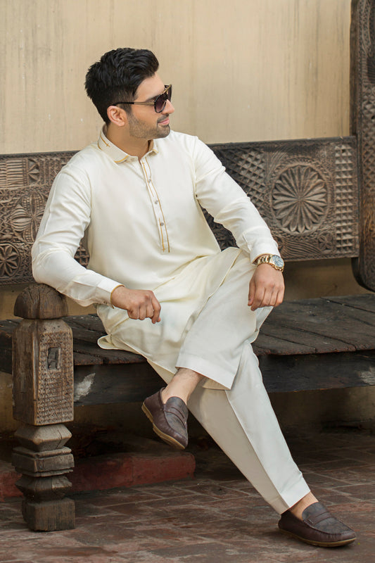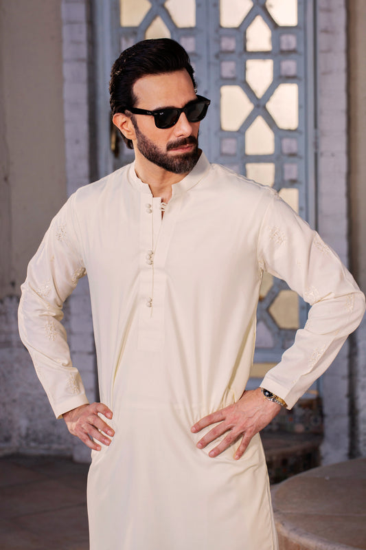 TAJ EMBROIDERED STITCHED SUIT - Egg White