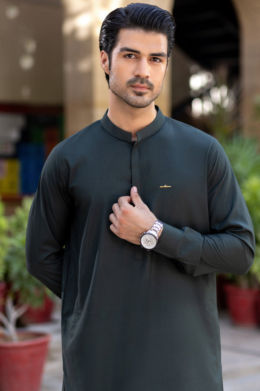 Olive gol gehra collar kurta with golden button, 1.5cm logo & farshi shalwar Collar