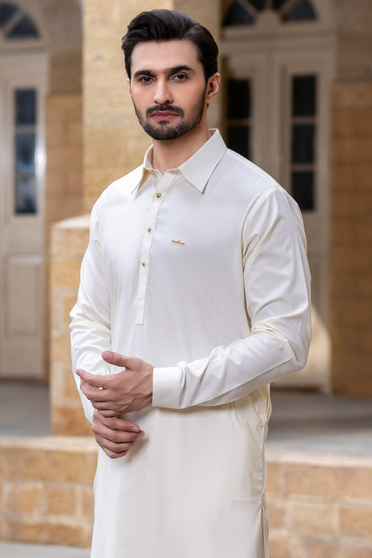 Ivory-cream gol gehra collar kurta with golden button, 1.5cm logo & farshi shalwar Collar