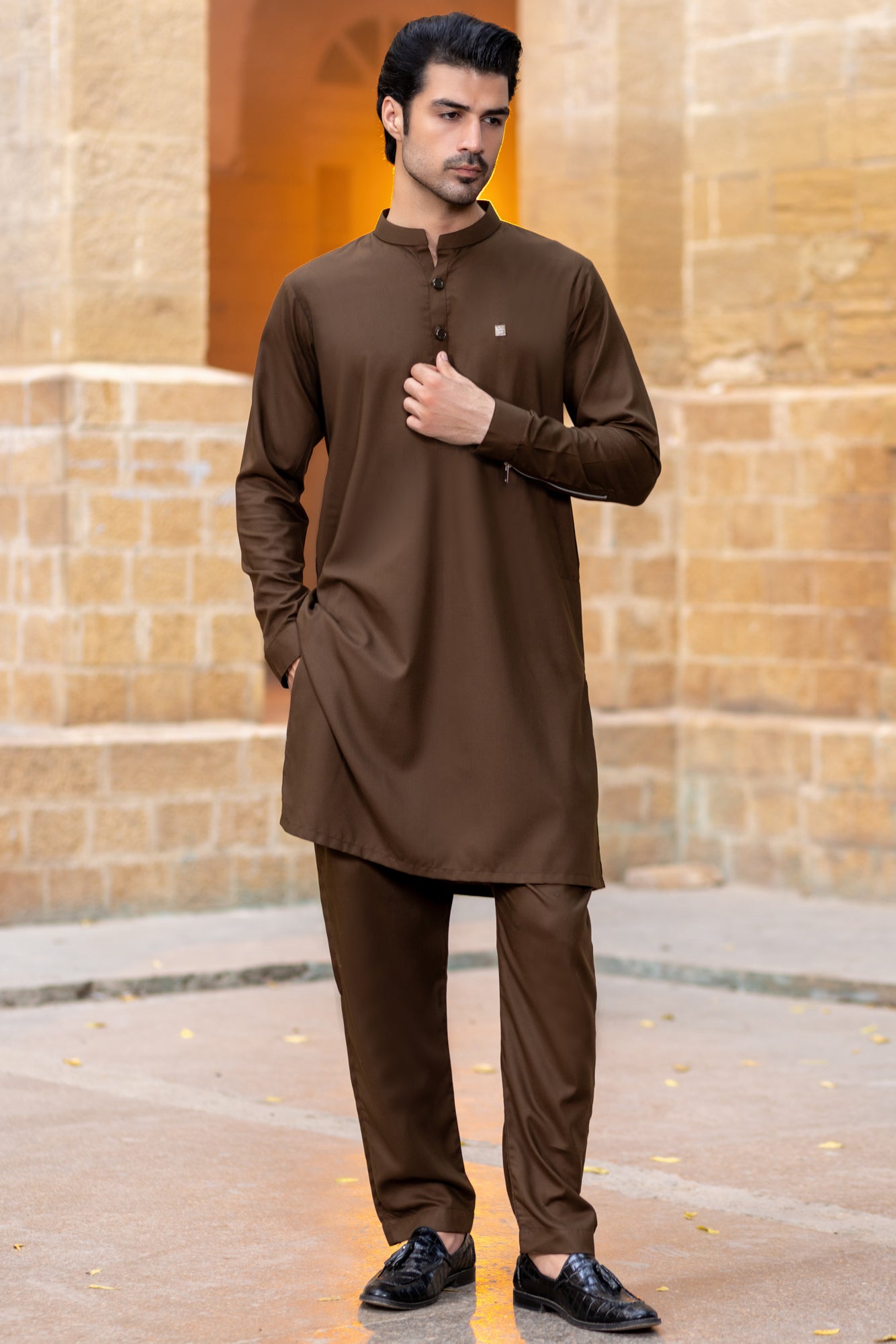 Chocolate-brown with metallic zips and coat metal button with badge and fake patti hook Ban
